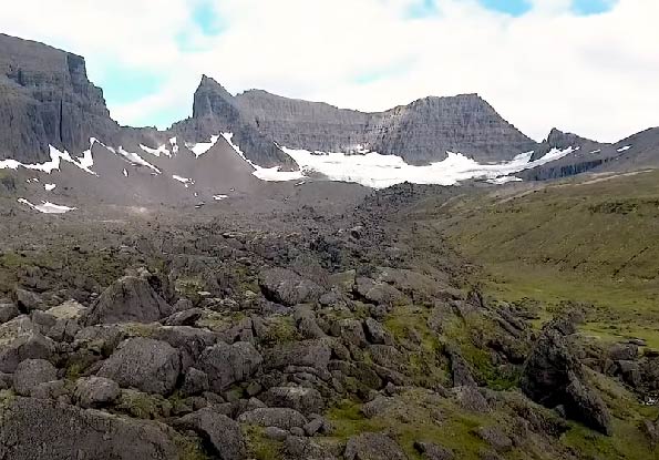 Stórurð is in Urðardalur in Hjaltastaðaþinghá. The current appearance of Stórurð is primarily shaped by the last ice age, which ended approximately ten thousand years ago. Its unique nature includes grass bales, tens of meters high boulders, blue-green ponds, and distinctive vegetation. It takes about six hours to walk to Stórurð from Vatnsskarð.
