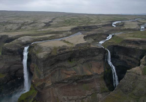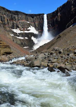 Hengifoss falls into Hengifossgljúfur, which is in the northern part of Fljótsdalur. It is the second-highest waterfall in the country, 128 meters high and majestic. A colorful rock face surrounding the waterfall shows different layers from the Tertiary period, six to eight million years ago. Bluish boulders mixed with beautiful red interlayers give the waterfall a unique look. Hengifossá originates in Hengifossvatn in Fljótsdalsheiði and flows through the gorge and down into Lagarfljót. It takes up to 50 minutes to walk from the parking place to the waterfall. Litlanesfoss is in the vicinity of Hengifoss and is crowned with a high basalt column, which is the highest in the country.