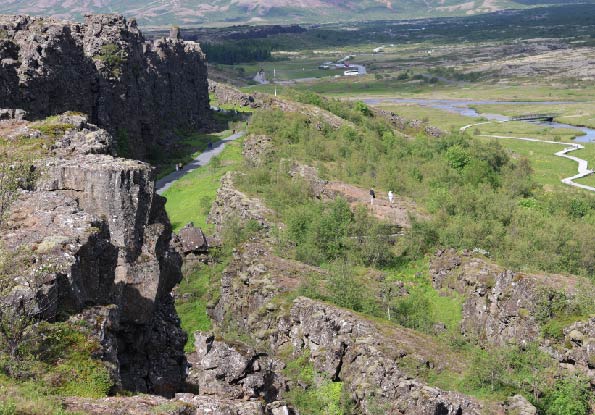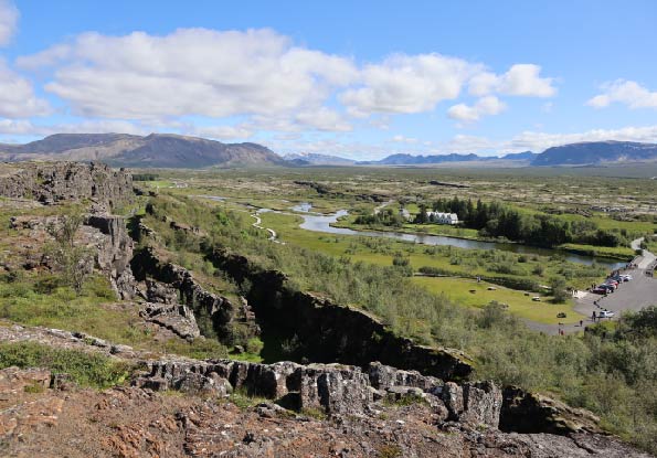Þingvellir are flat, grassy fields north of Þingvallavatn on the banks of Öxará, which flows along the fields into Þingvallavatn, which is the largest lake in Iceland.