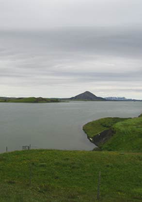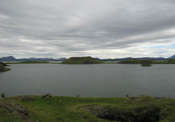 Mývatn is a lake close to Krafla. Mývatn is the fourth-largest lake in the country, 37 square kilometers, and has 40 small islands. Lake Mývatn is very shallow. The ecosystem of Lake Mývatn is diverse.