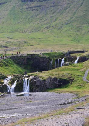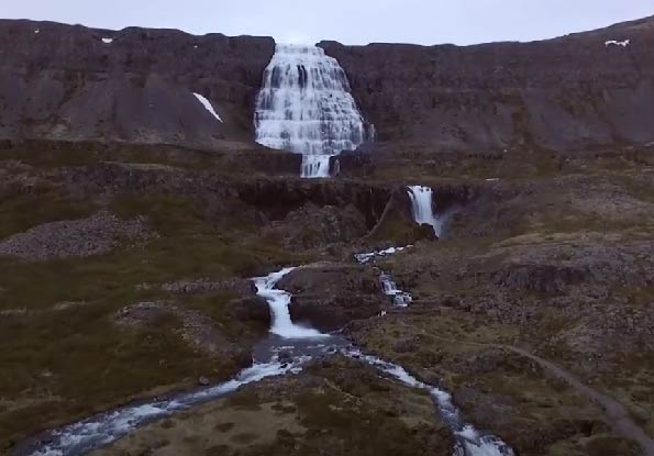 Dynjandi is the largest waterfall in the Westfjords. It is in Dynjandisvogur at the bottom of Arnarfjörður. The waterfall and its surroundings were protected as natural monuments in 1981, as they are a unique natural pearl. Dynjandi is in the river Dynjandi, which flows down from Dynjandisheiði. It originates in several lakes on the heath on the edge of the Gláma highlands. The glacial area is characterized by glacial ridges and depressions in which small lakes have accumulated. Dynjandi falls 100 meters high and is a bulging rock. The waterfall ladder has been created due to the stratification of the rock into lava layers and loose intermediate layers. The waterfalls are lava layers, but the river has dug up the intermediate layers. There are six waterfalls in Dynjandi. At the top is Fjallfoss, then Hundafoss, Strokkur, Göngumannafoss, Hrísvaðsfoss and Sjóarfoss.