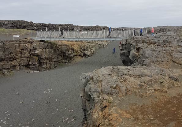 Brúin in Reykjanes is a bridge at the plate crossing between Europe and America. According to geological theories, the Eurasian and North American rafts are pushed apart in Reykjanes. The raft boundaries are bounded by eruptions, ravines, and craters from Reykjanes and the country's northeast. It can be said that the Reykjanes Ridge (Mid-Atlantic Ridge) "walks" ashore on Reykjanes, but with it lies the return of these two rafts. Iceland is thus divided between two crustal plates. The eastern part of the country belongs to the so-called Eurasian rafts, and the western part belongs to the so-called North American rafts. The separation between the rafts appears either as open cracks and ravines or as rows of craters.