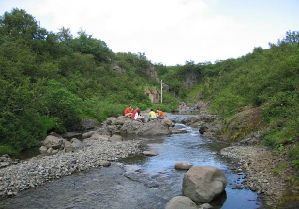Þjóðveldisbærinn is in in Þjórsárdalur. Þjóðveldisbærinn is a replica based on one large farm of the republican age. The model of the farm is the ruins of the former main farm, Stöng in Þjórsárdalur; it is believed that this farm was deserted during the Hekla mountain eruption in the year 1104.
