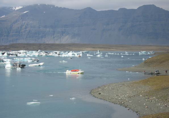 Jökulsárlón is a large glacial lagoon at Breiðamerkurjökull in the southern part of Vatnajökull National Park. The lagoon is 25 square km in area, and its depth is 290 meters. Jökulsárlón is the deepest lake in the country. Large icebergs, which have broken off Breiðamerkurjökull, float on the lagoon. Jökulsá on Breiðamerkursandur flows from the lagoon and transports the icebergs to the sea. Diamond Beach is near the lagoon, where some icebergs come ashore and spread around the beach.