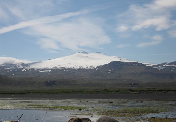 Snæfellsjökull is a 1446 m high glacier west of Snæfellsnes, within the National Park, and its surface area is 10 square kilometers. Deep down under Snæfellsjökull, an active volcano formed during many eruptions, most recently eighteen hundred years ago. Its eruption history can be traced to seven hundred thousand years back in time; most of the top crater's eruptions have been either explosive eruptions or lava eruptions. Since the end of the ice age, eruptions have occurred over 20 times in and around the glacier, and three of the eruptions were erratic for eight thousand years, four thousand years, and eighteen hundred years. Háahraun covers most of the southern slope of Snæfellsjökull. The glacier has shrunk in recent years. Snæfellsjökull is an active volcano.